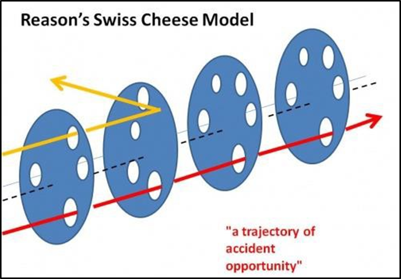 The ‘Swiss Cheese’ model of accident causation, originally proposed by James Reason, likens human system defences to a series of slices of randomly-holed Swiss cheese arranged vertically and parallel to each other, with gaps between each slice.