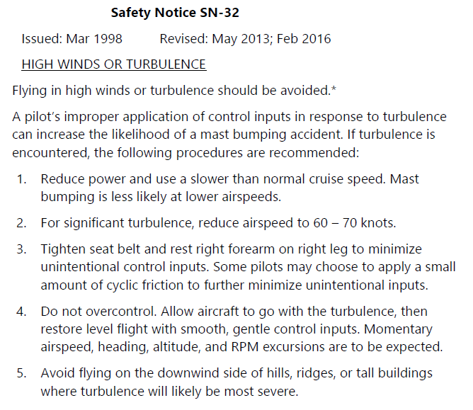 - Pilots of RHC helicopters need to be familiar with Safety Notice 32 and the associated video, and avoid flying in high winds and turbulent conditions.