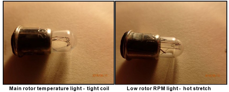 - Both the 'Clutch' and the 'Low Rotor RPM' (low rotor revolutions per minute) warning and caution lights at the top of the panel displayed evidence of hot stretch. The remaining warning and caution lights either showed no evidence of hot stretch or were too damaged to provide any information.