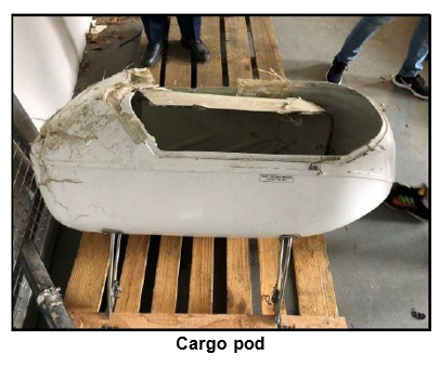 - It was exceptionally unlikely that the cargo pod, located on the left side of the helicopter, came loose in flight and caused a loss of control. The pod was found on the lakebed within a few metres of the main wreckage. This, combined with damage to the front of the pod and its attachment fittings, confirms that the pod very likely separated as the helicopter struck the water nose-first.
