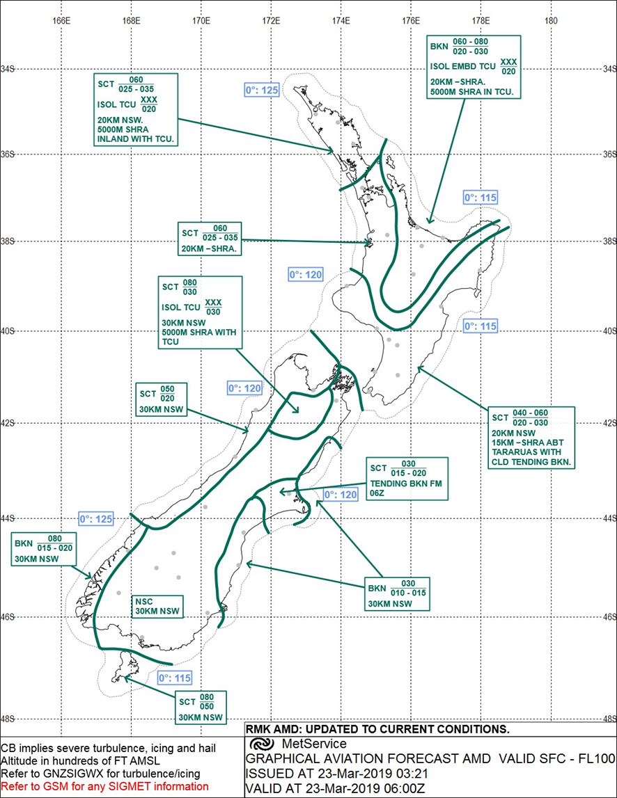 - The graphical aviation forecast (GRAFOR) valid for approximately three hours prior to the time of the accident (see Figure 6) specified for the Bay of Plenty and Taupō area broken cloud (cloud is measured in eighths or oktas. Broken cloud is 5 -7 oktas) between 2,000-3,000 feet (609-914 m) and 6,000-8,000 feet (1,828-2,438 m), isolated embedded towering cumulonimbus above 2,000 feet, 20 km visibility with showers and rain and 5 km visibility with showers and rain in towering cumulonimbus cloud.