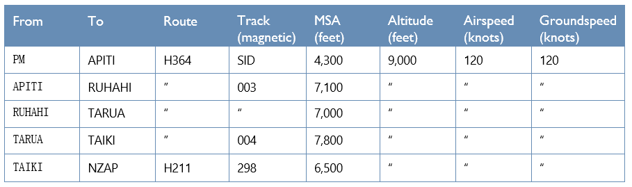 - The pilot also submitted an IFR flight plan to Air Traffic Services (ATS) for all three of the flight sectors from Ardmore to Palmerston North and return. The flight plan included a proposed take-off time from Ardmore of 1930 for the flight to Palmerston North. The return flight to Ardmore was to be via Taupō and was planned for a take-off from Palmerston North at 2140 and an arrival at Taupō 45 minutes later. The planned route from Palmerston North to Taupō was via reporting points APITI, RUAHI, TARUA and TAIKI at an altitude of 9,000 feet. This would result in the aeroplane approaching Taupō Aerodrome from an easterly direction. The return time at Ardmore was planned to be 2330 (this was earlier than the booking time return of 0030, which allowed for potential delays along the way).