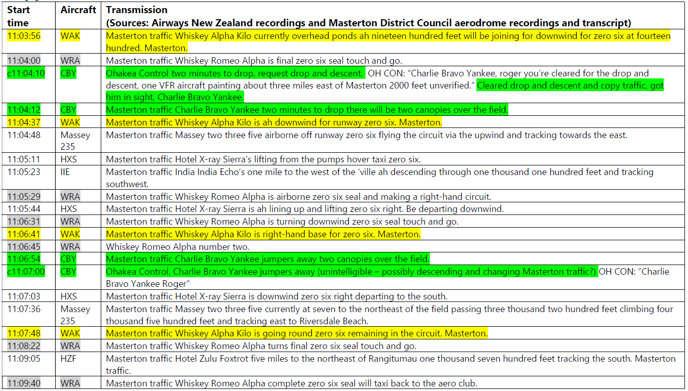 - At 1104:37, the pilot of ZK-WAK called downwind for runway 06. Two minutes later the pilot called right base for 06. At 1106:54, the pilot of ZK-CBY made a radio call reporting “jumpers away, two canopies over the field”. The aeroplane then descended with the pilot only on board. At 1107:48, the pilot of ZK-WAK called ”going around 06, remaining in the circuit”.