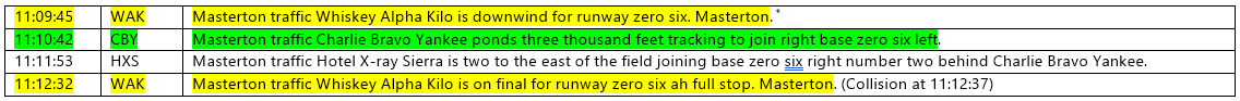 - At 1112:32, the pilot of ZK-WAK radioed advising ”Masterton traffic, Whisky Alpha Kilo is on final for runway 06, full stop Masterton”. ZK-WAK and ZK-CBY collided immediately on completion of this transmission.