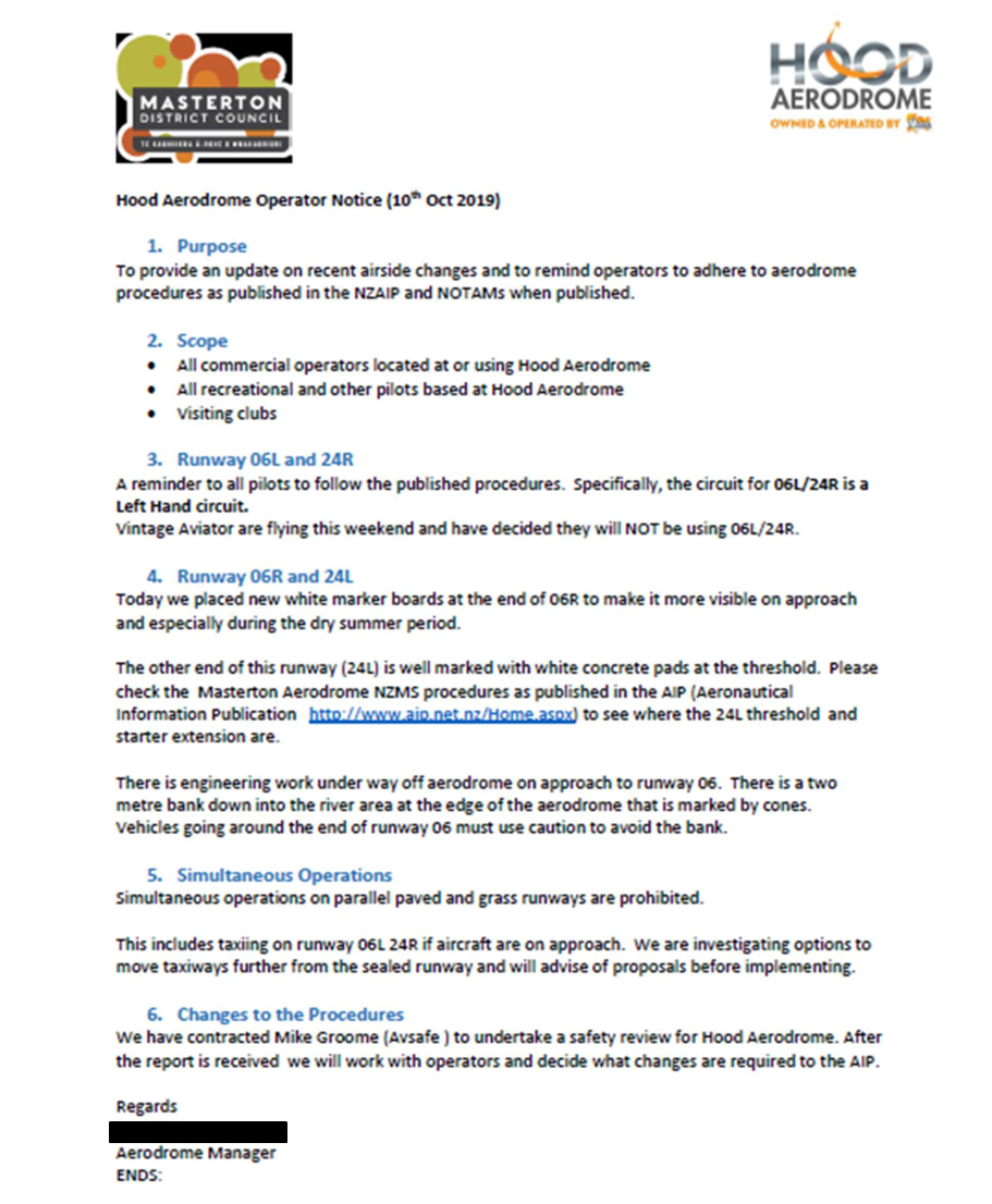 - The aerodrome manager and the safety committee were also collating a documented risk management framework, known as a safety management system (SMS), for aircraft operations (a system for hazard identification and risk management, safety targets and reporting processes, procedures for audit, investigations, remedial actions and safety education). Masterton Aerodrome, as a non-certificated aerodrome, was not required to have an approved SMS and the MDC reported there was some opposition to adopting one. However, it was agreed by the aerodrome manager and major users that an SMS would provide a useful safety tool. Any work on the aerodrome was undertaken in accordance with MDC’s health and safety policy.