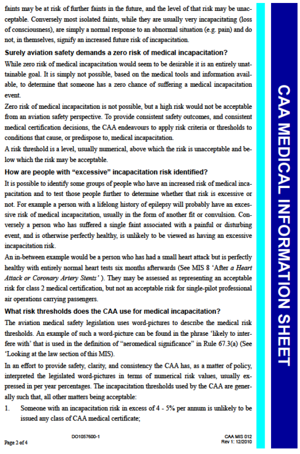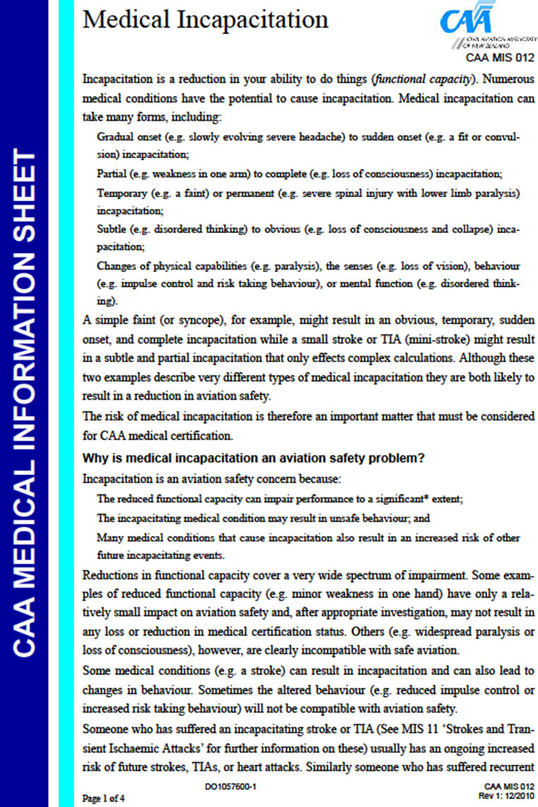 - The Civil Aviation Authority of New Zealand has published Medical Information Sheet 012 – Medical Incapacitation on the range of conditions that can be classed as medical incapacitation (Civil Aviaton Authority of New Zealand, 2010). See Appendix 1.