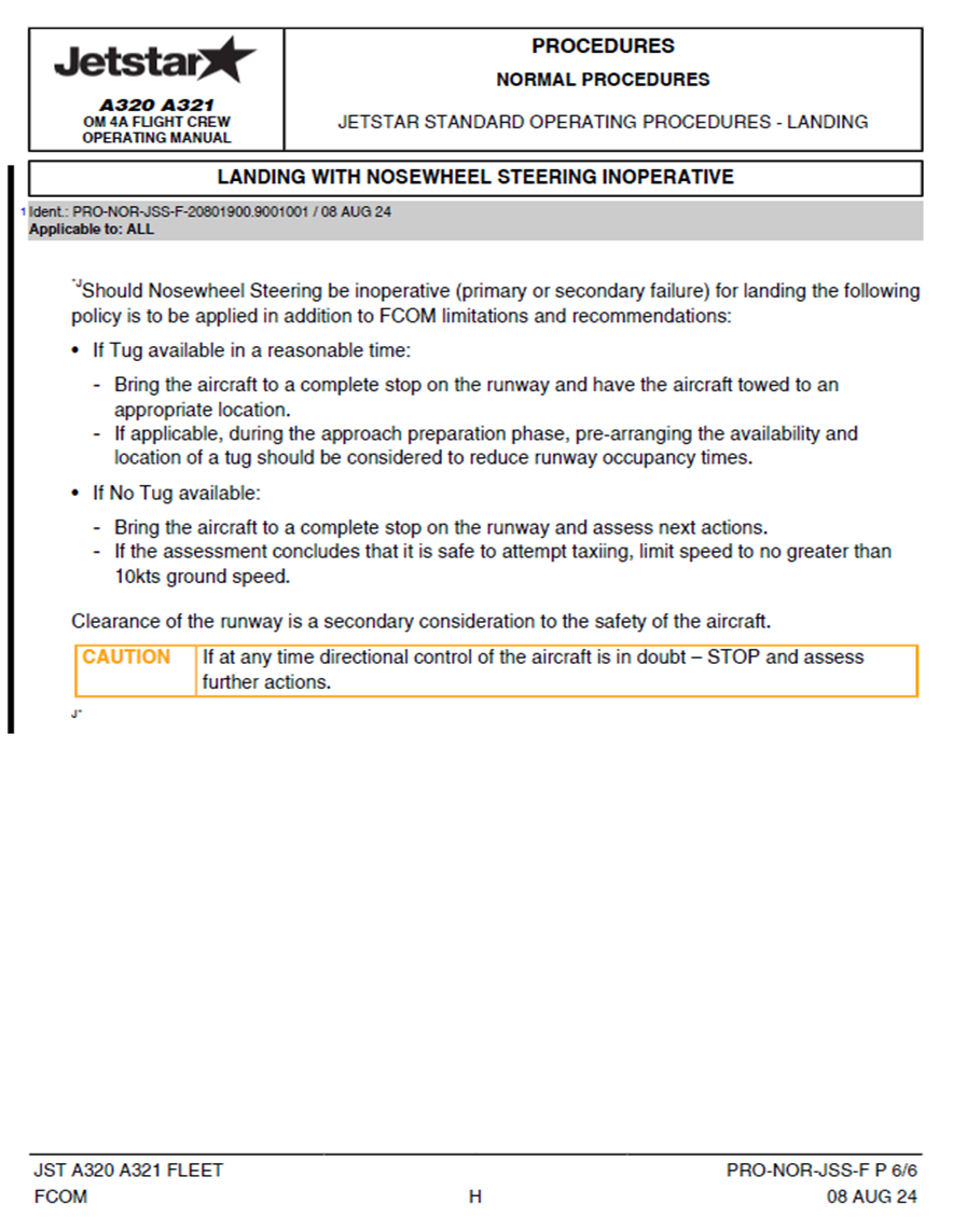 Jetstar issued a new landing and taxiing SOP for a nosewheel steering failure in August 2024, as a result of this accident.