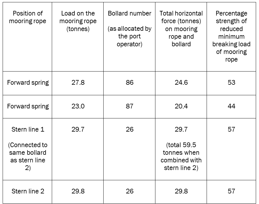 - Evidence provided by the port’s closed-circuit television (CCTV) security camera showed that the failure of shore bollards and ropes occurred in the following sequence: