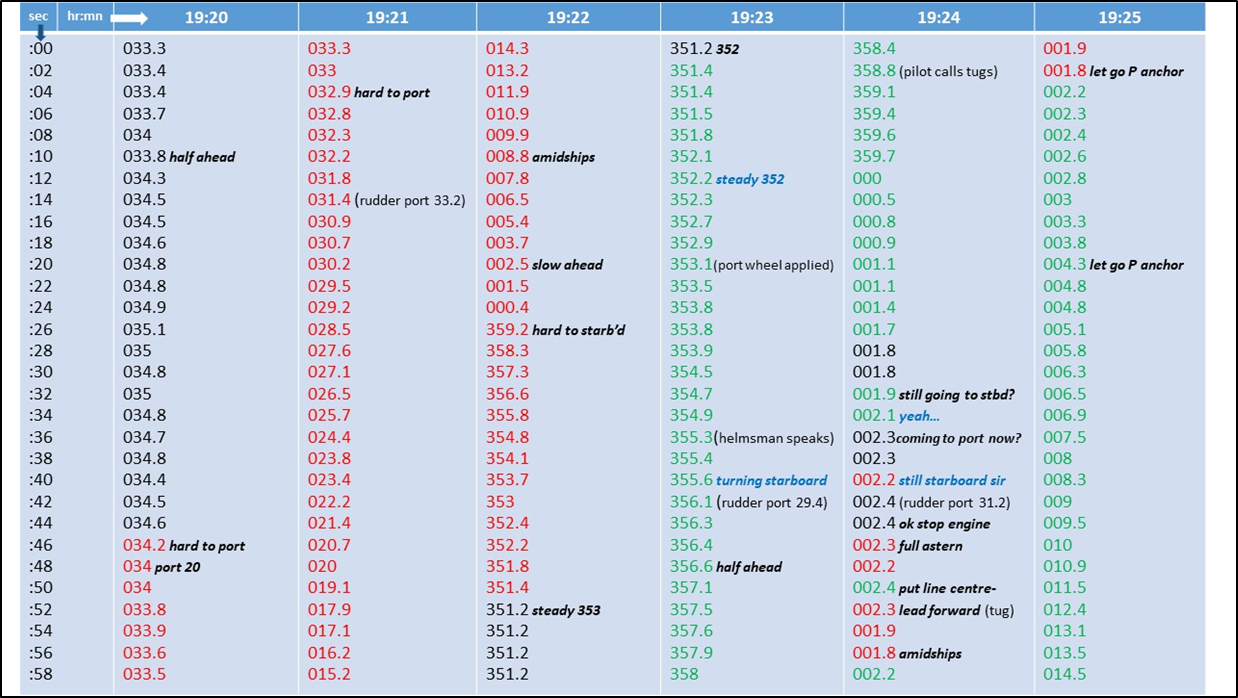 - At 1921:50, as the vessel’s heading passed through 020°, the pilot requested that the helm be put amidships (when a vessel’s steering is centred, to attain 0° of rudder angle) and the engine speed be reduced further to slow ahead. At 1922:27 the pilot ordered the helm to be put hard to starboard to arrest the swing to port. The pilot then requested the helmsman to steady the ship’s heading on 353°. Eight seconds later the pilot amended this to a heading of 352°.