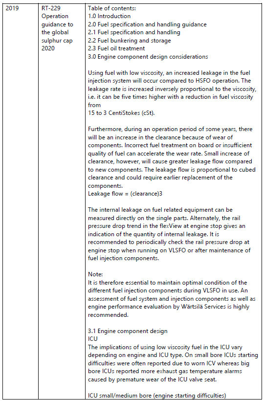 - Wärtsilä provided a technical bulletin, RT-229, titled Operation Guidance to the Sulphur Cap 2020, which targeted all owners and operators of Wärtsilä two-stroke engines.