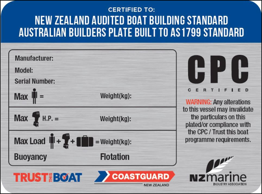 - Newer vessels may have been built under the New Zealand Audited Boat Building Standard, which is a voluntary standard and safety initiative adopted by many New Zealand boat manufacturers. Vessels built using the Compliance Plate Certification (CPC) programme display CPC plates similar to that shown in Figure 10. The programme was introduced in 1999 and covers manufacturing processes, materials, construction methods and fuel and electrical systems. Vessels less than 6 metres in length must have enough reserve buoyancy to prevent their sinking if they are swamped. The buoyancy is provided by the installation of buoyant materials, distributed around the hulls to provide either basic (basic flotation is a vessel’s ability to stay afloat, whether inverted, upright or in any other orientation, after a flooding and capsize event) or level flotation (see Appendix 1).