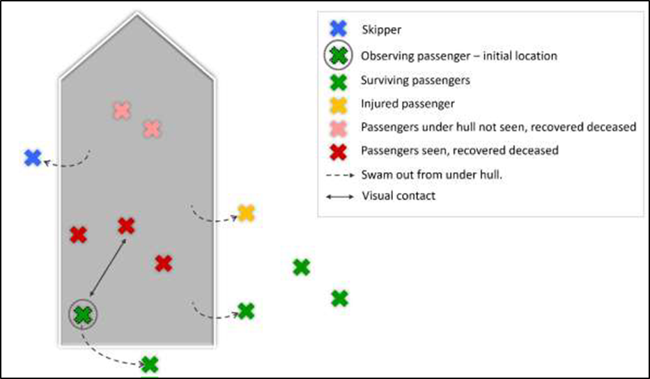 - Eight passengers and the skipper were initially underneath the upturned hull. Two passengers swam out straightaway from underneath the vessel without inflating their lifejackets; the skipper took two attempts to swim out (see Figure 4).