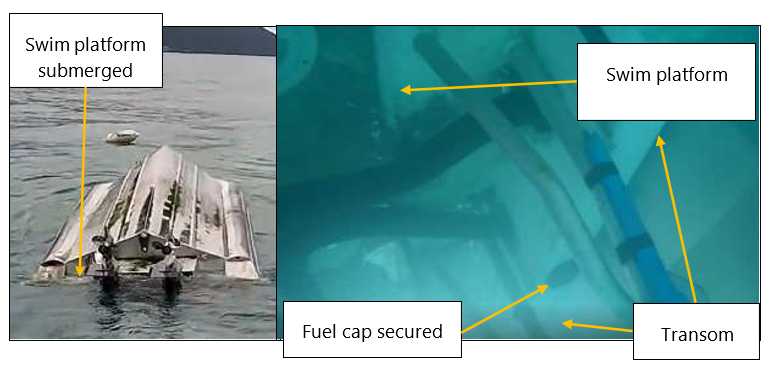 - The alloy vent tube terminated inside an alloy towing frame on the transom just forward of the swim platform (see Figure 14 and Figure 15). A pressure test of the alloy frame revealed that it was closed off from the atmosphere, preventing fuel vapours from venting to open air and rendering it ineffective as a fuel-tank vent.