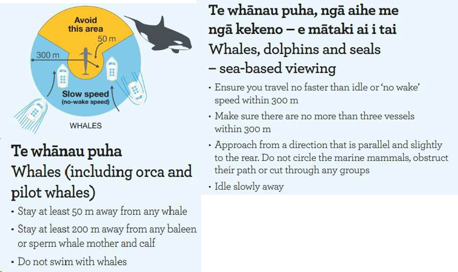 The Department of Conservation (DOC) provides guidance for boaters operating around marine mammals, to help keep both marine mammals and people safe. The guidelines recommend that boaters avoid operating in front of whales to avoid impeding their natural direction of forward motion.