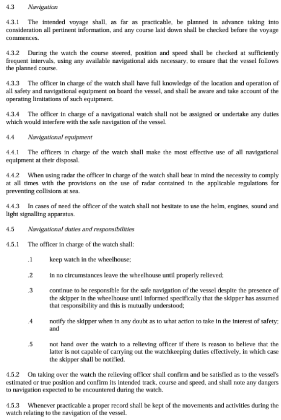- Chapter IV of the Annex to the International Convention on Standards of Training, Certification and Watchkeeping for Fishing Vessel Personnel provides the navigational watchkeeping standards to be followed by all fishing vessels. The risk of groundings and collisions will be higher if these standards are not followed.