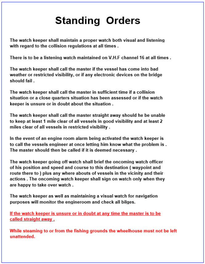 - implement procedures to ensure that watchkeeping alarms, independent of all other equipment, are fitted and used in the wheelhouse whenever a navigational watch is undertaken