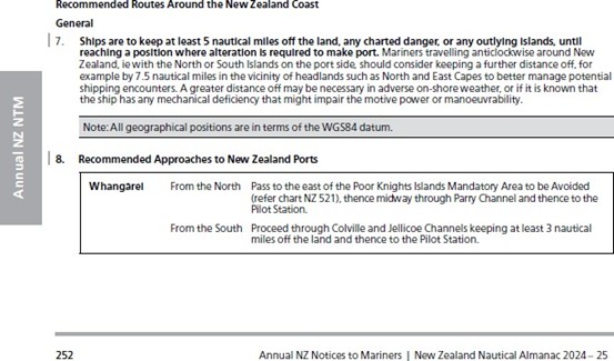 - Maritime New Zealand issues an Annual Notice to mariners (the New Zealand Nautical Almanac is published by Land Information New Zealand Toitū Te Whenua) in the New Zealand Nautical Almanac (see Appendix 1). It contains safety and navigation information, including information on the obligations of the master with respect to safe navigation and passage planning. It also contains directions for the recommended routes around New Zealand and the recommended routes into New Zealand ports.