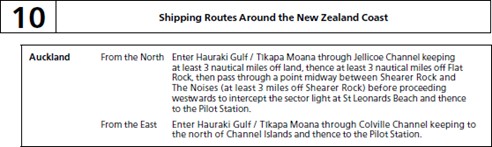 “Enter Hauraki Gulf/Tikapa Moana through Jellicoe Channel keeping at least 3 nautical miles off land, thence at least 3 nautical miles off Flat Rock, then pass through a point midway between Shearer Rock and The Noises (at least 3 miles off Shearer Rock) before proceeding westwards to intercept the sector light at St Leonards Beach and thence to the Pilot Station.”