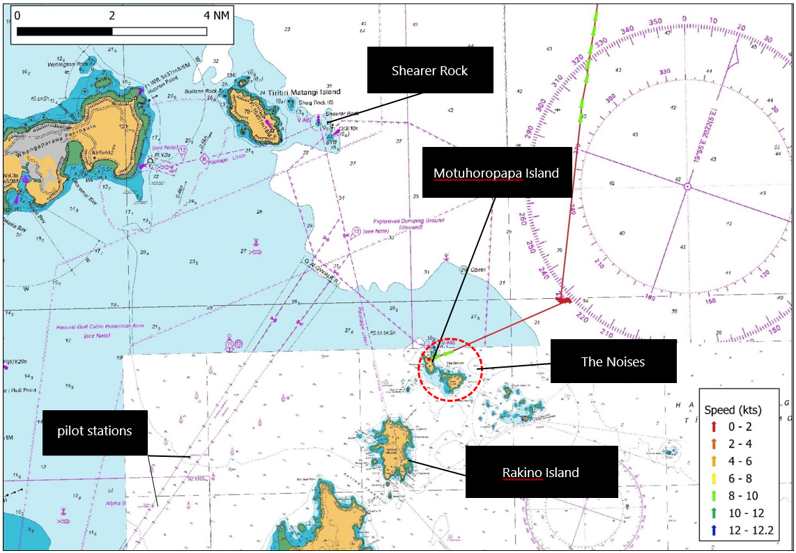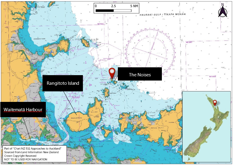 - There was no planned track loaded into the chart plotter or laid out on a paper chart. The paper chart folio on board the Chokyu Maru No.68 did not contain the paper chart NZ 532 ‘Approaches to Auckland’ and there was only a basic coastline indicated on the chart plotter. The smaller islands of the Hauraki Gulf, including The Noises, were not displayed on the chart plotter and there were no physical navigation marks installed to mark this island group. This meant there were no lights to see. Without a copy of the British Admiralty Sailing Directions: New Zealand Pilot (NP51) (the British Admiralty Sailing Directions provide essential information to support port entry and coastal navigation for all classes of ships at sea. Coverage includes the world’s main commercial shipping routes and ports.) or any large-scale chart information, the master and the chief officer were not aware of the navigational hazards in their location. As a result, neither the master nor the chief officer realised that the vessel was heading towards Motuhoropapa Island and its outlying rocks (see Figure 9).
