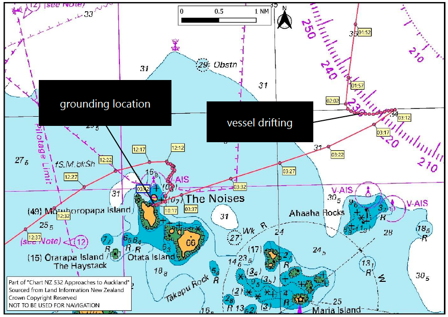 - There was no planned track loaded into the chart plotter or laid out on a paper chart. The paper chart folio on board the Chokyu Maru No.68 did not contain the paper chart NZ 532 ‘Approaches to Auckland’ and there was only a basic coastline indicated on the chart plotter. The smaller islands of the Hauraki Gulf, including The Noises, were not displayed on the chart plotter and there were no physical navigation marks installed to mark this island group. This meant there were no lights to see. Without a copy of the British Admiralty Sailing Directions: New Zealand Pilot (NP51)14 or any large-scale chart information, the master and the chief officer were not aware of the navigational hazards in their location. As a result, neither the master nor the chief officer realised that the vessel was heading towards Motuhoropapa Island and its outlying rocks (see Figure 9).
