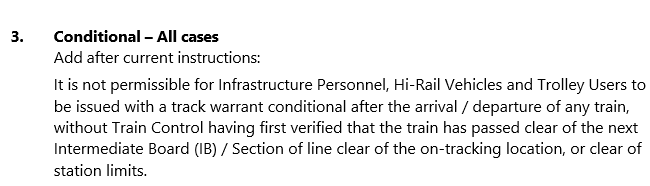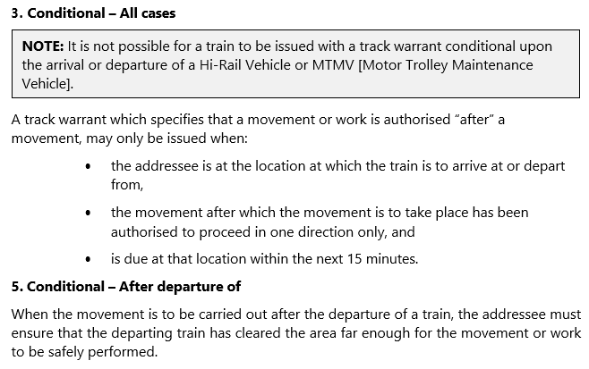 - The track warrant control rules did not allow train controllers to issue train drivers with track warrants conditional on the departures of hi-rail vehicles. Train controllers were however permitted to issue track warrants to drivers of hi-rail vehicles conditional upon the departure of trains.