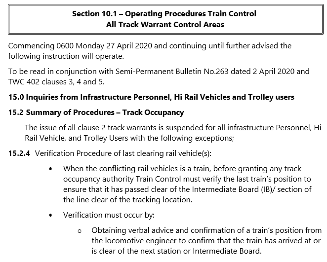 - The KiwiRail Rail Operating Rules, issue 7, effective from 6 October 2019, section 4, track warrant control rule 402, stated in part: