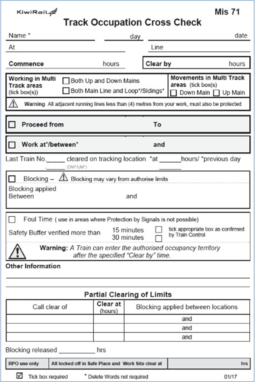 - The addressee obtaining the blocking would then complete an Mis 71 Track Occupation Cross Check form (see Appendix 1), with the instructions issued by TC, including the: