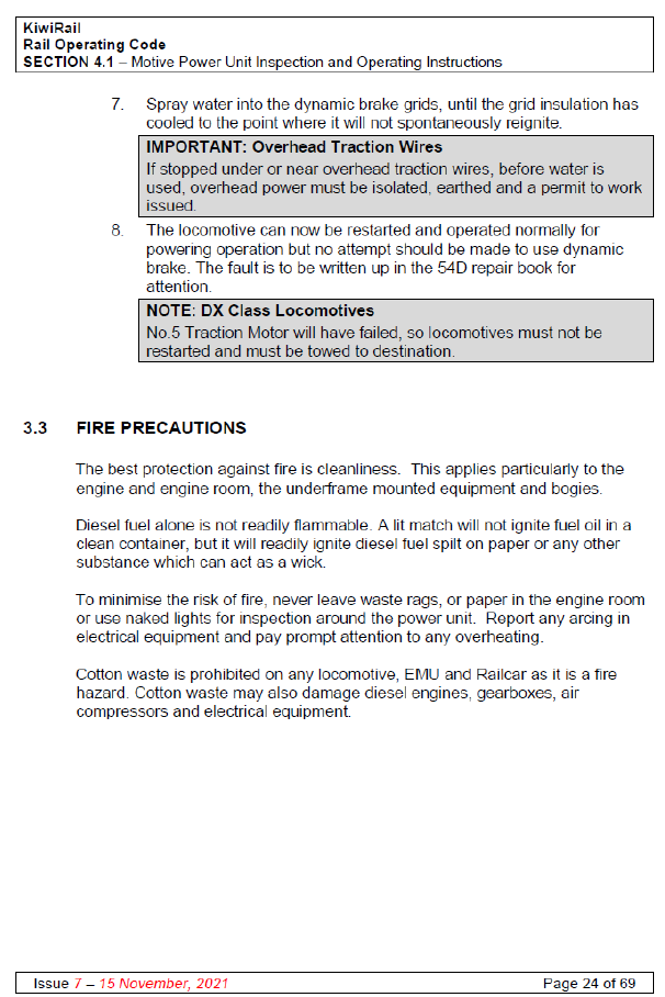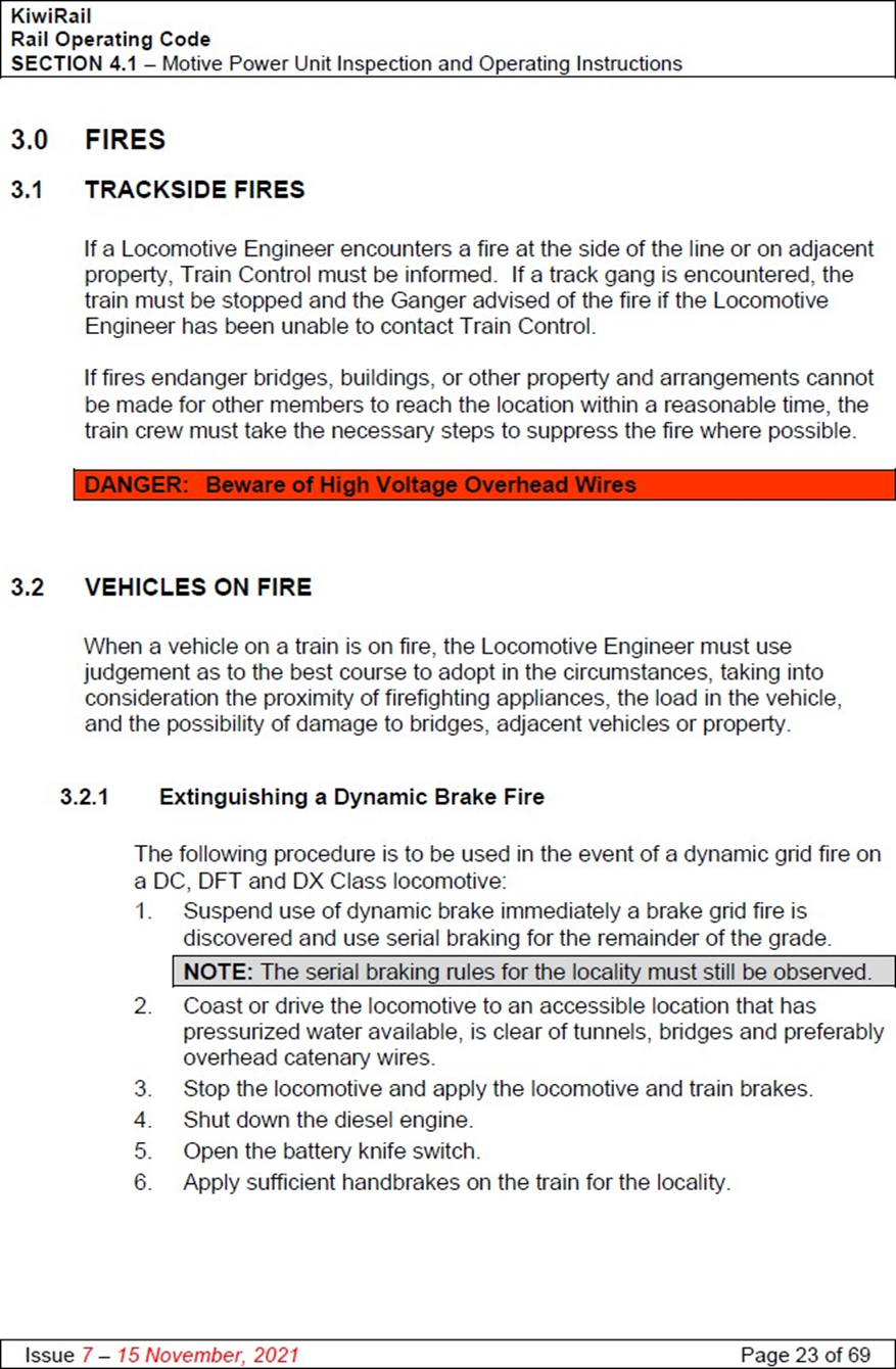 KiwiRail had produced guidelines for the event of a vehicle on fire. Clause 3.2 of Section 4.1 (Motive Power Unit Inspection and Operating Instructions) of the KiwiRail Rail Operating Code (see Appendix 1) states: