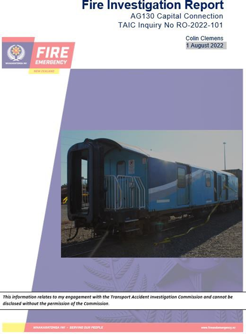 - At about 0602, on 11 May 2022, the Capital Connection express passenger train was at the platform of Palmerston North station when the train manager discovered a fire on board the auxiliary generator wagon.