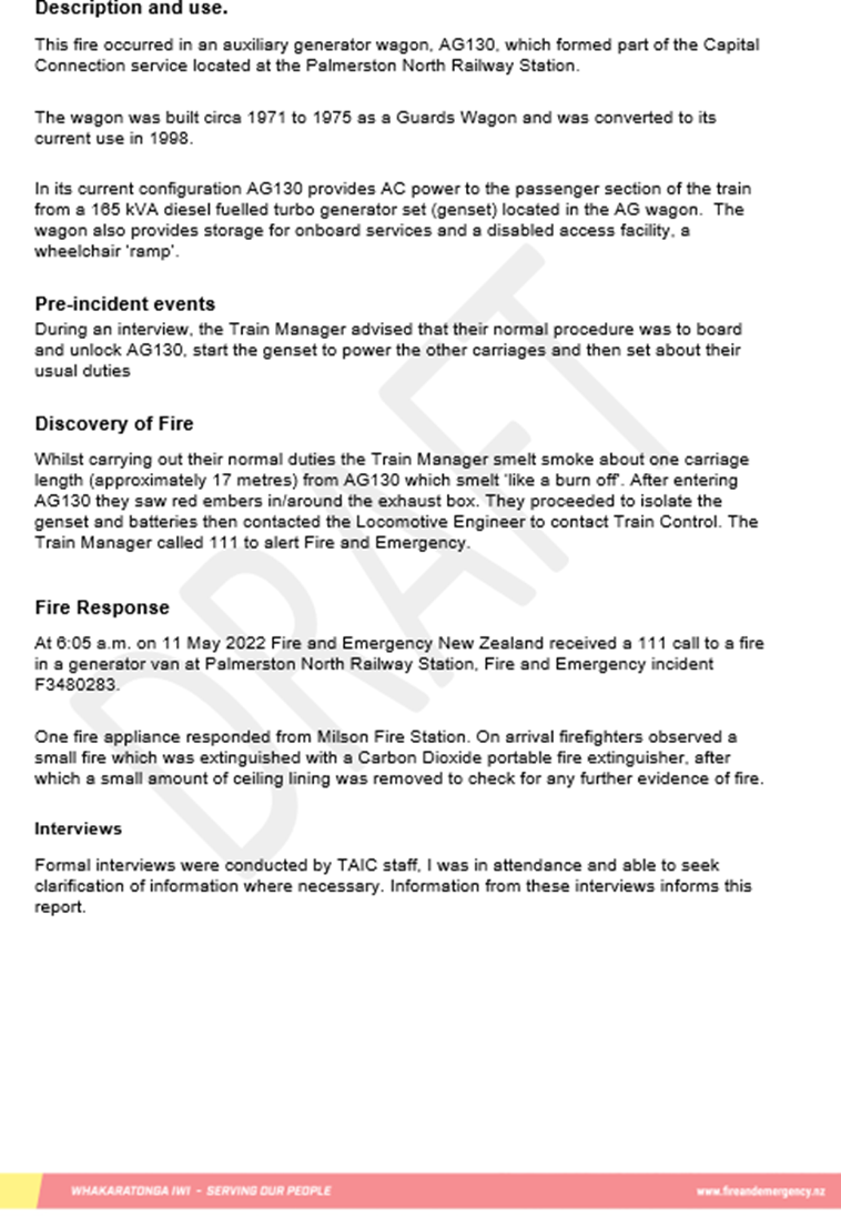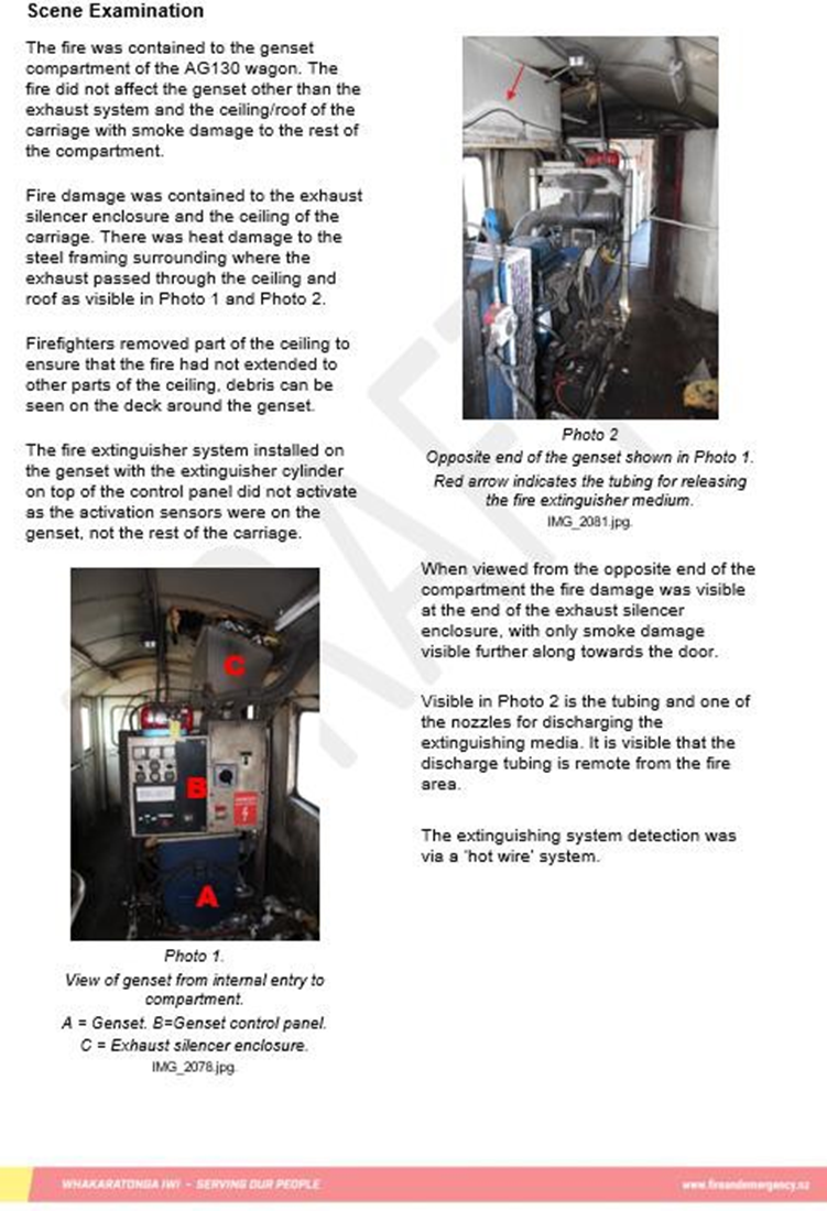 - The train manager contacted Fire and Emergency New Zealand to report the fire and a fire appliance responded. On arrival firefighters observed a small fire in the auxiliary generator wagon, which they extinguished with a carbon dioxide portable fire extinguisher.