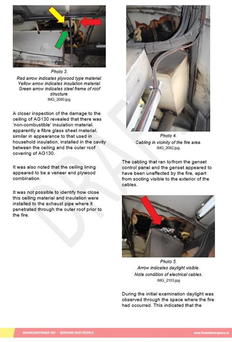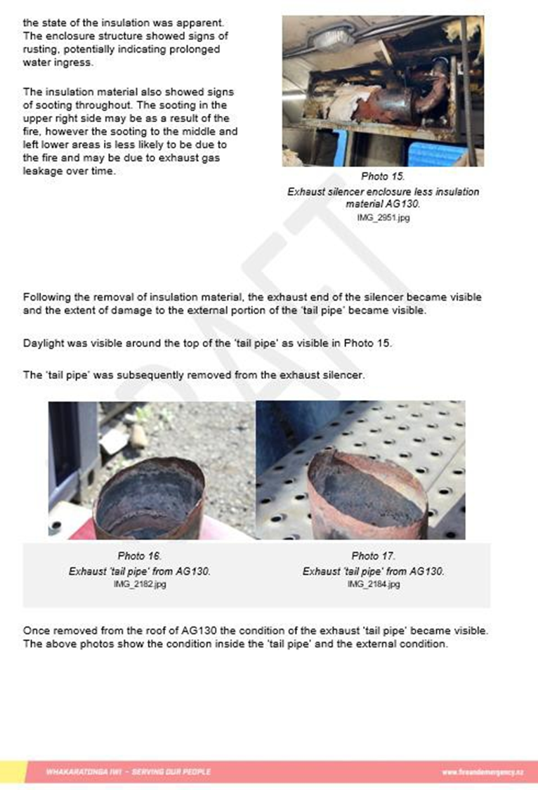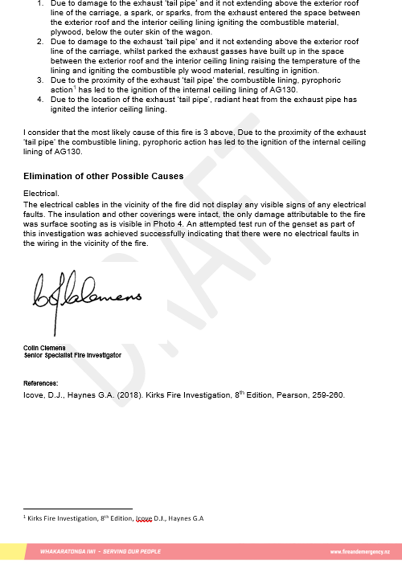 - The independent fire investigator engaged by the Commission determined that the fire in AG130 was accidental (see Appendix 3: Fire Investigation Report), They also determined that the fire was likely caused by pyrophoric action (arising from the proximity of the exhaust tail pipe to the combustible lining) leading to the ignition of the internal ceiling lining.