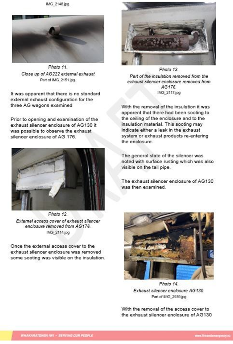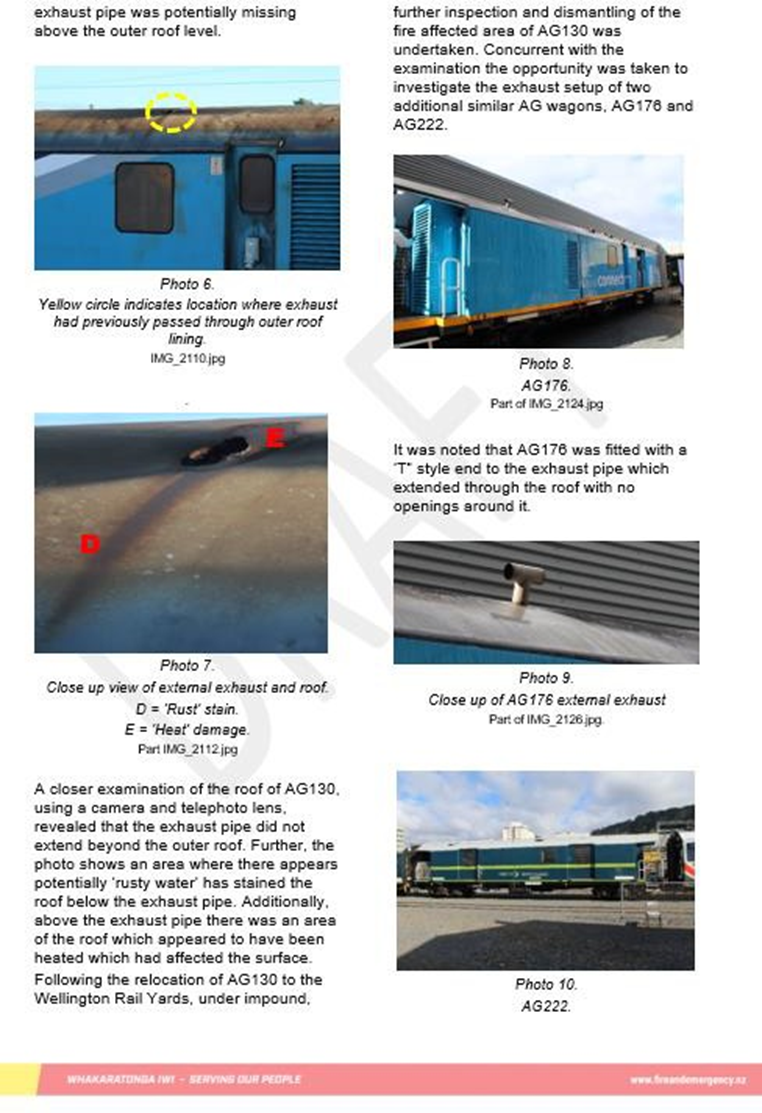 - The Commission inspected the exhaust systems of three AG wagons: AG130, AG176 and AG222. The AG130 and the AG176 were owned by KiwiRail, while the AG222 was occasionally leased by KiwiRail from Greater Wellington Regional Council. The AG130 exhaust system was the only one in which the exhaust tail pipe was missing, so that the auxiliary generator set’s exhaust did not extend up through the top box and out through the roof (see Figure 5).