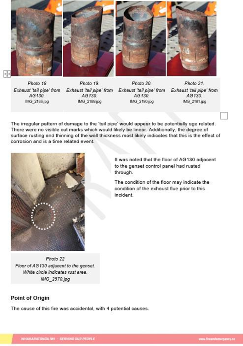 - The fire was confined to the auxiliary generator set enclosure of AG130, affecting the exhaust system and the ceiling of the wagon. There was smoke damage throughout AG130 (see Figure 8).