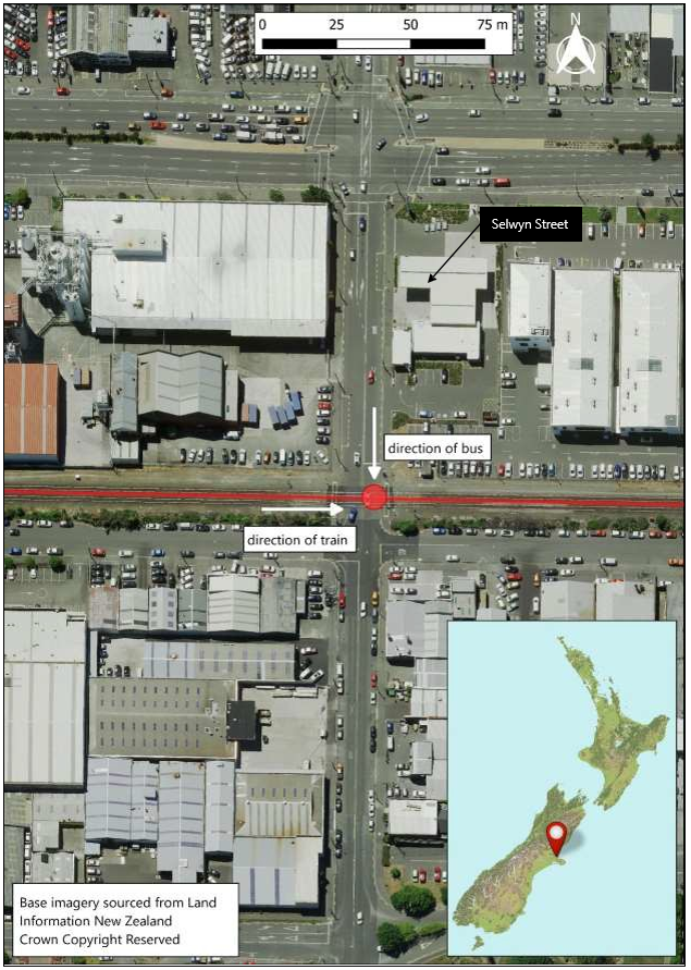 - On Monday 8 August 2022, while the level crossing remained disconnected, a ‘Go Bus’-operated Christchurch Metro passenger bus drove across the Selwyn Street level crossing as a KiwiRail locomotive approached. The bus passed approximately 12 metres in front of the locomotive, creating a ‘near-miss’ situation. There was no collision, no damage and no injuries.