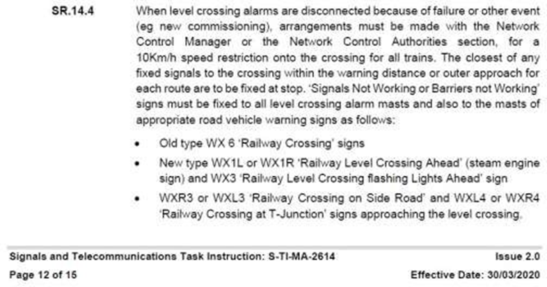 - When the decision was made to bypass the fail-safe mode and disconnect the level crossing alarms and barriers before the problem was rectified, it effectively reopened the level crossing to road traffic, but with a far lower standard of protection – passive protection only in the form of ‘signals not working’ signage and high visibility covers over the warning lights.