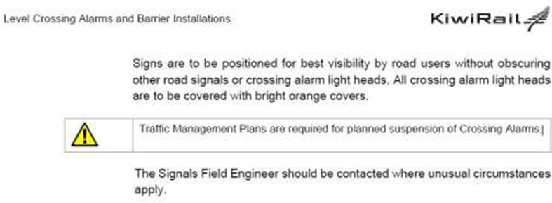 - KiwiRail’s Task Instructions on disconnecting level crossing alarms and barriers (KiwiRail Signals and Telecommunications Task Instruction Level Crossing Alarms and Barrier Installations S-TI-MA-2614 SR.14.4 (see Appendix A))(see Appendix 1) gave instruction for when the disconnection was unplanned to implement a 10 km/h speed restriction for trains, fix signals at stop, cover warning lights and establish signage. For a planned disconnection, further risk mitigation in the form of a traffic management plan was required.