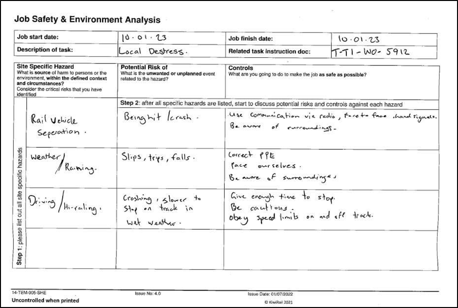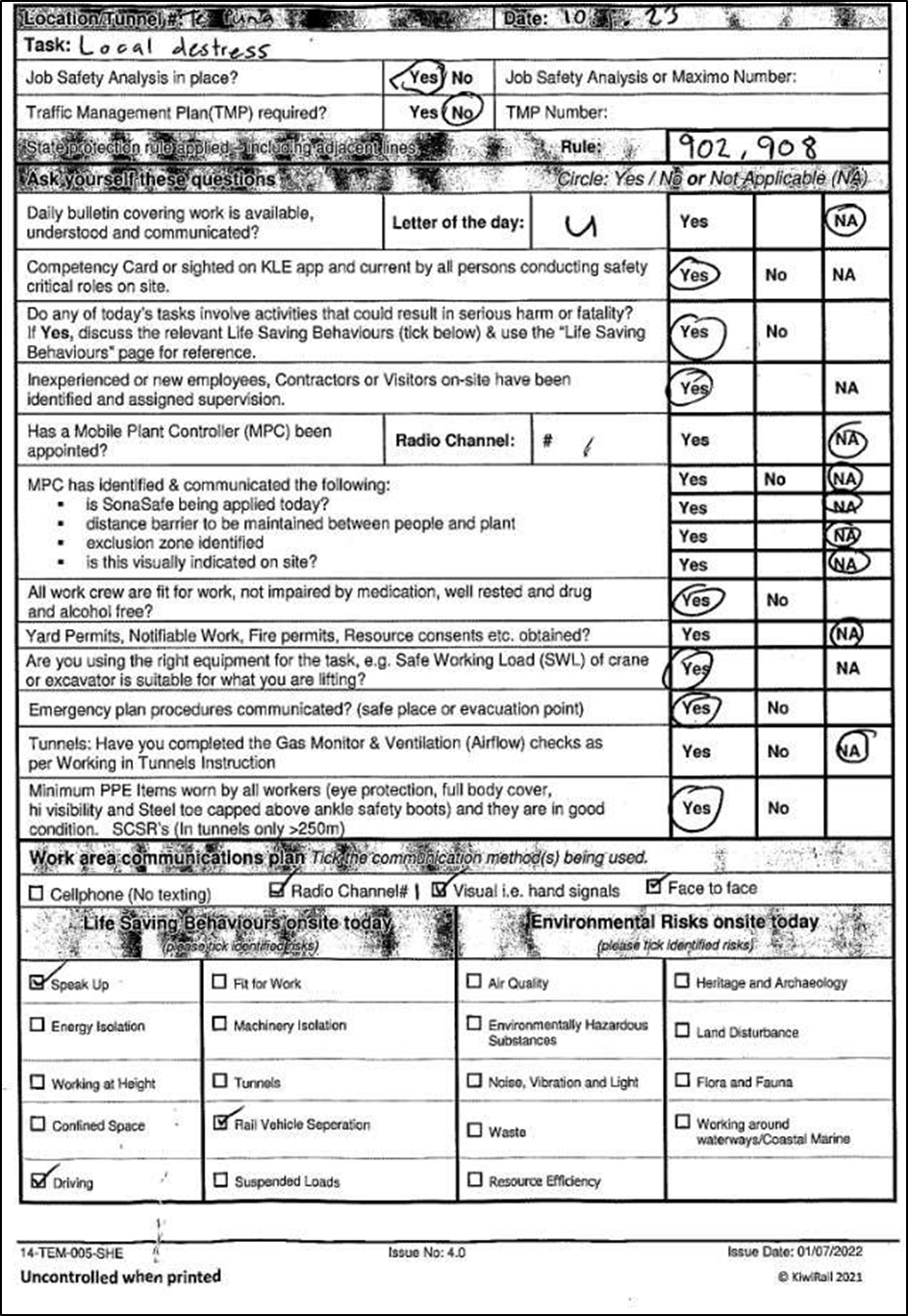 - On arrival at the on-tracking location, the work gang carried out a pre-start meeting. This included completion of a Job Plan using KiwiRail’s Job Plan Book (referred to as a TS90 book) and a safety-briefing on the work location, work tasks, protection arrangements, health and safety details, communications plan and specific site hazards (see Appendix 1).