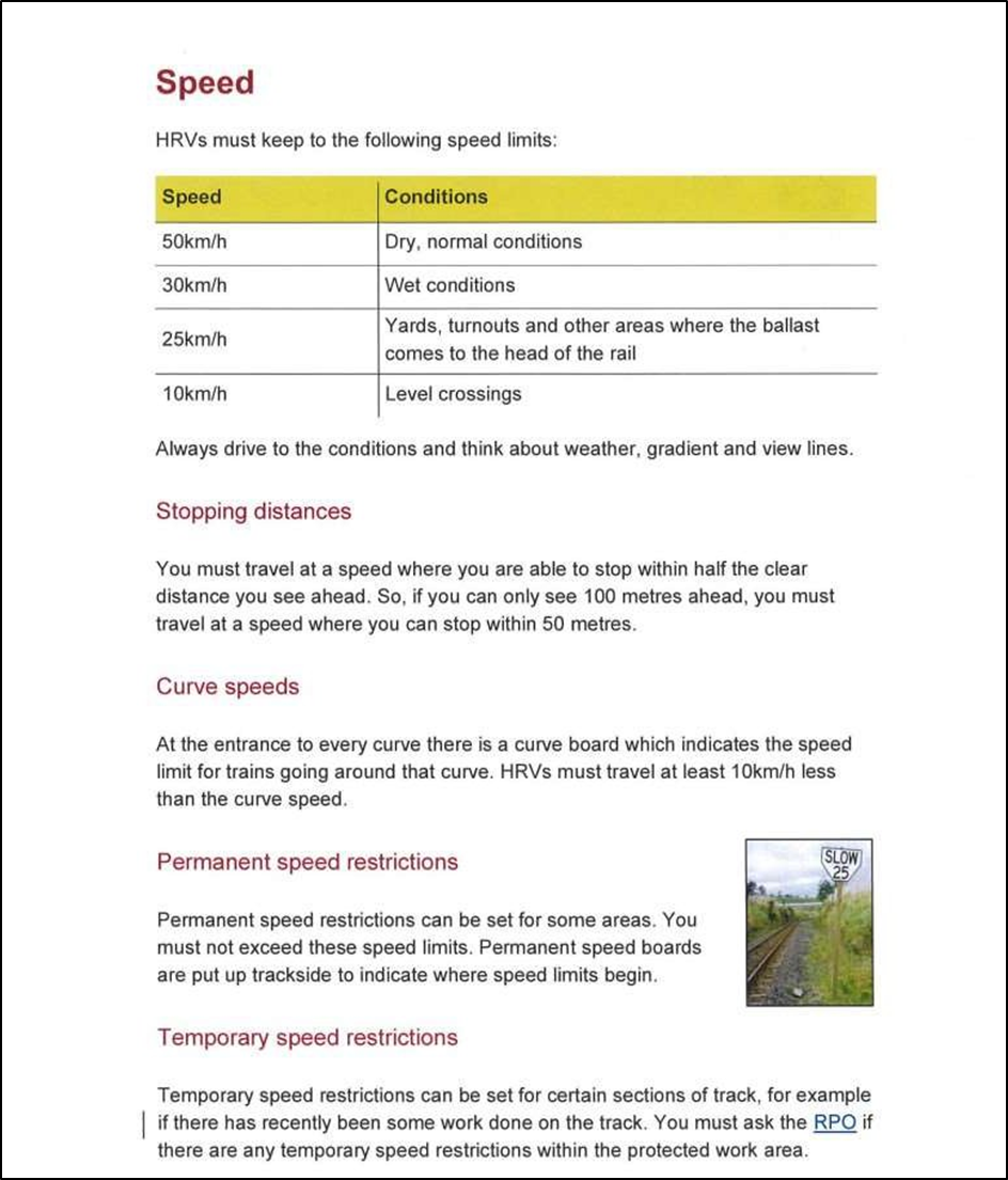 - The TPBM workbook contained information for operators of HRVs that aligned with KiwiRail’s Rail Operating Rule 916 – Hi Rail Vehicle and Trolley – Drivers responsibilities (see Appendices 2 and 3)