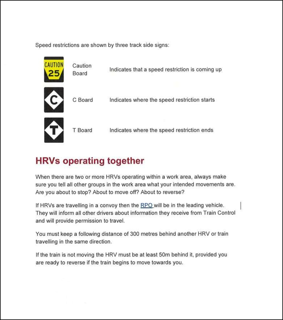 Rather than being a comprehensive HRV training programme, the TPBM course was designed to give personnel operating HRVs (such as Hi-Rail diggers and other maintenance vehicles) a basic understanding of the requirements of arriving on site, on-tracking and working on-track in a protected work area under the supervision of a RPO. This basic course was considered necessary as some operators, such as non-KiwiRail contractors, may not have been familiar with KiwiRail’s HRV safety requirements. The TPBM workbook stated in part:
