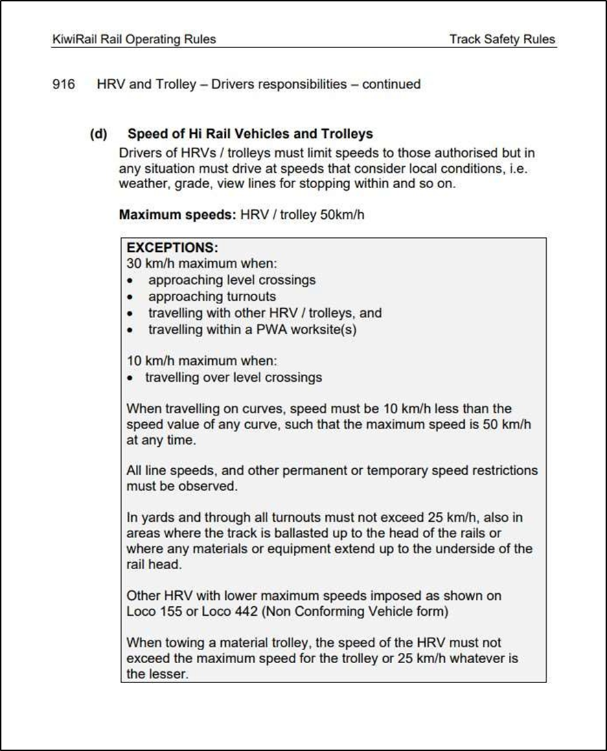 - Because of the wet weather conditions at the time and of also travelling in convoy, the HRVs should have been travelling at no more than 30 kilometres per hour (km/h), and at such a speed that they would have been able to stop within half the clear distance that could be seen ahead (KiwiRail Rail Operating Rules – Track Safety Rule 916(c)-(d) – HRV and Trolley – Driver’s responsibilities (also see Appendix 3)).