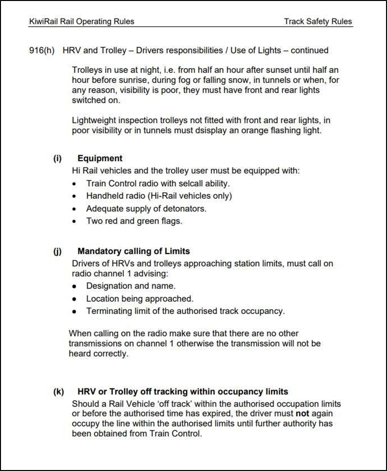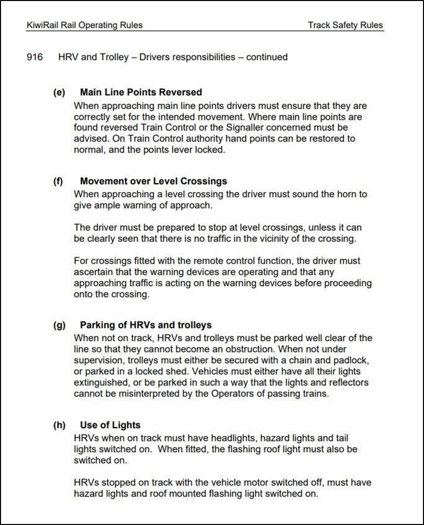 Appendix 3. KiwiRail Rail Operating Rule 916 Hi Rail Vehicle and Trolley – Drivers responsibilities