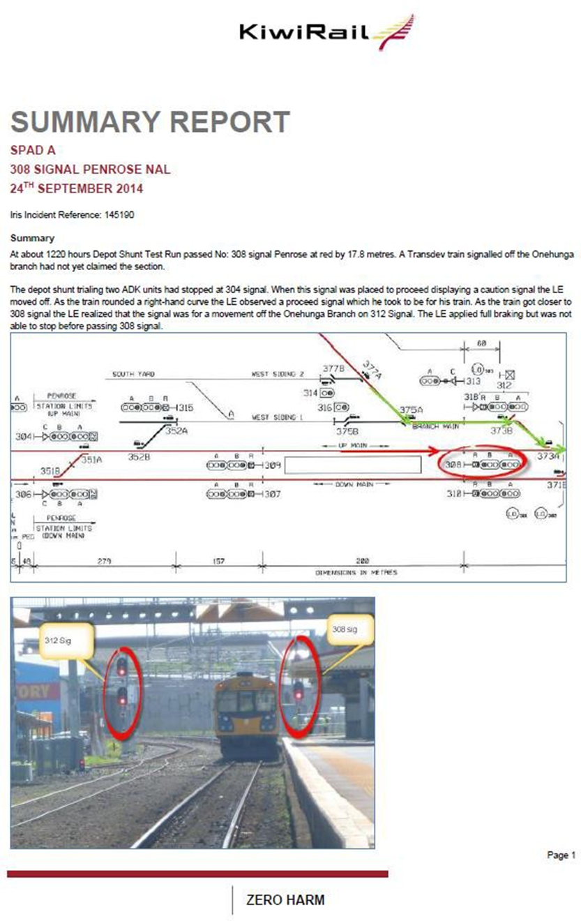 - In 2014 a Transdev Auckland train passed signal 308 at stop at Penrose, Auckland. The train had passed the preceding signal 304 at a caution (yellow) signal. As the train rounded the right-hand curve, the driver observed a proceed signal, which they took to be the next signal for their movement. However, as the train got closer the driver realised that the signal was for a movement on the OBL. The driver applied full braking but was not able to stop before passing signal 308. While the Commission did not open an inquiry, KiwiRail carried out an investigation (see Appendix 1 for a summary of the KiwiRail report).