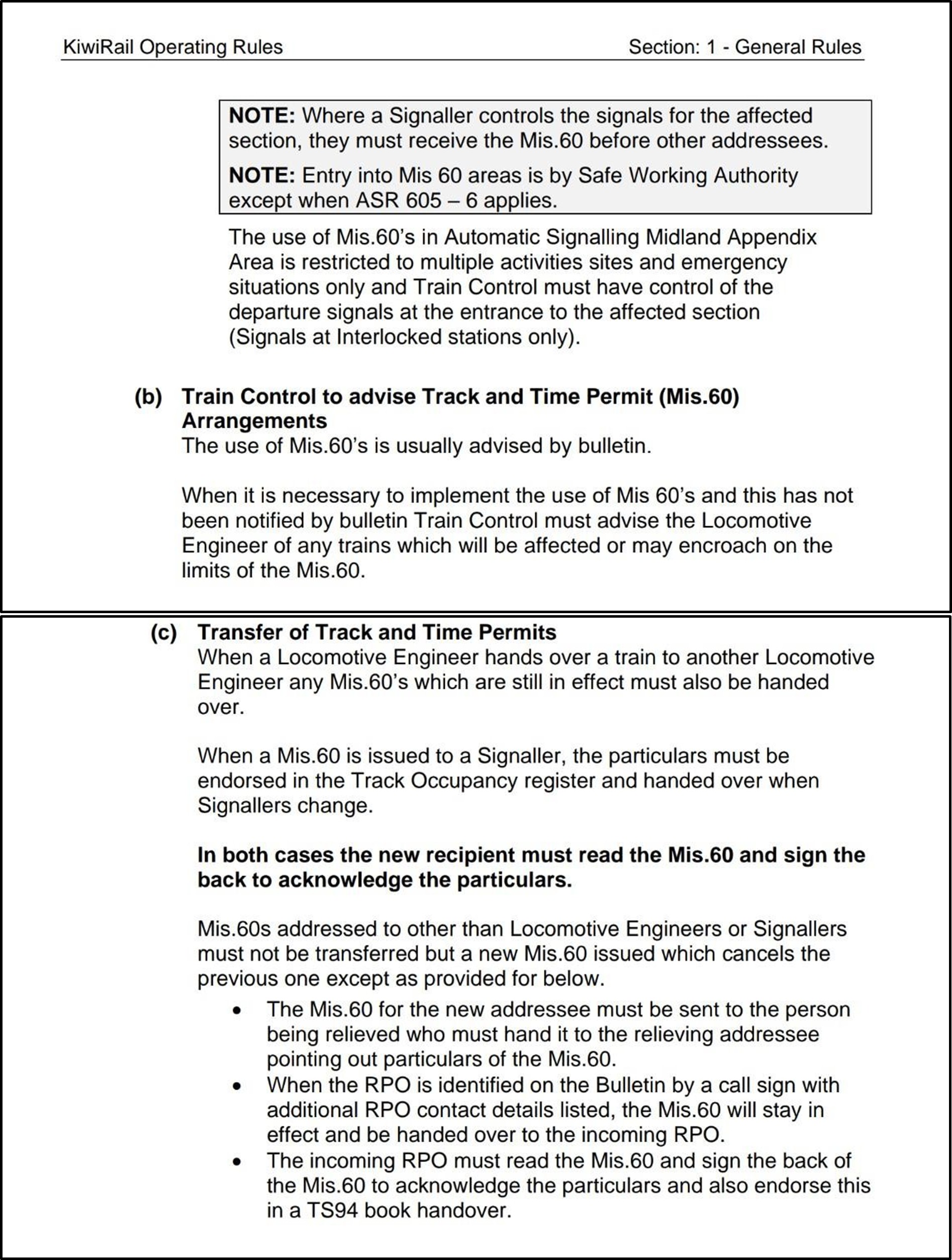 - The issuance of a Mis.60 prevented rail traffic and personnel entering the protected area unless specifically named in the permit and permission was sought from and granted by the Rail Protection Officer (RPO) holding the Mis.60.