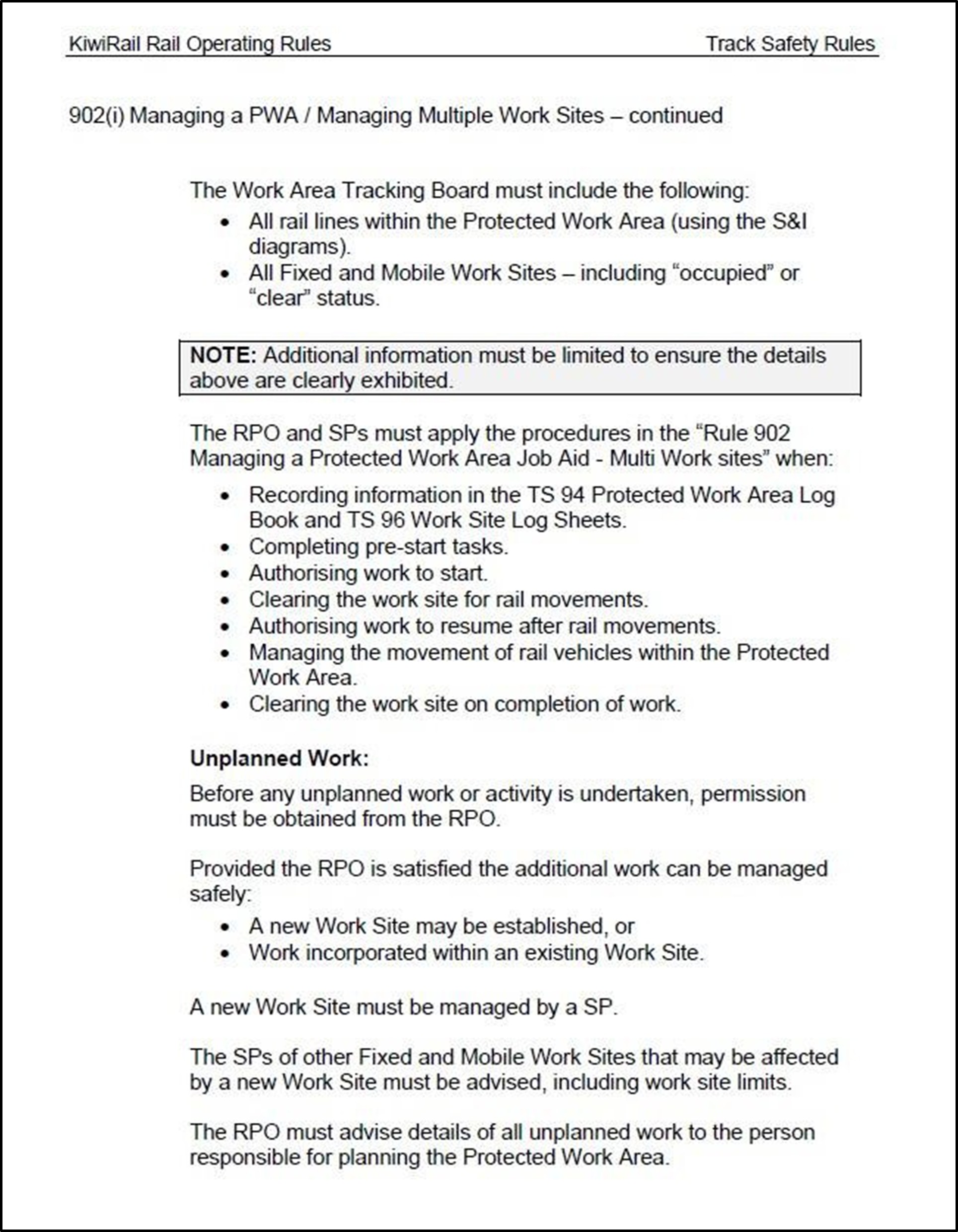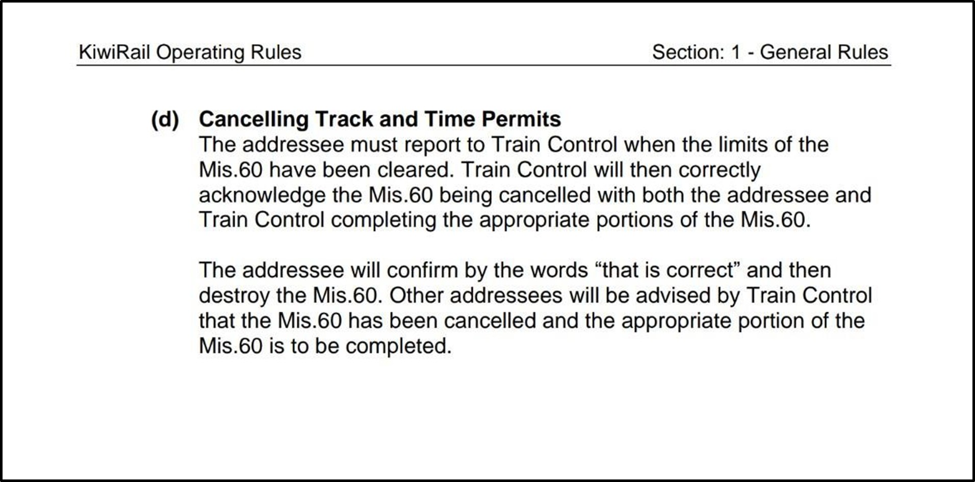 - KiwiRail’s process for authorising rail movements within the project worksite was inadequate for ensuring the safe movement of rail traffic within a protected work area. The requirement for two separate parties to authorise movements when neither had knowledge of the track status likely led to a lower level of oversight as each was expecting the other to have such knowledge.