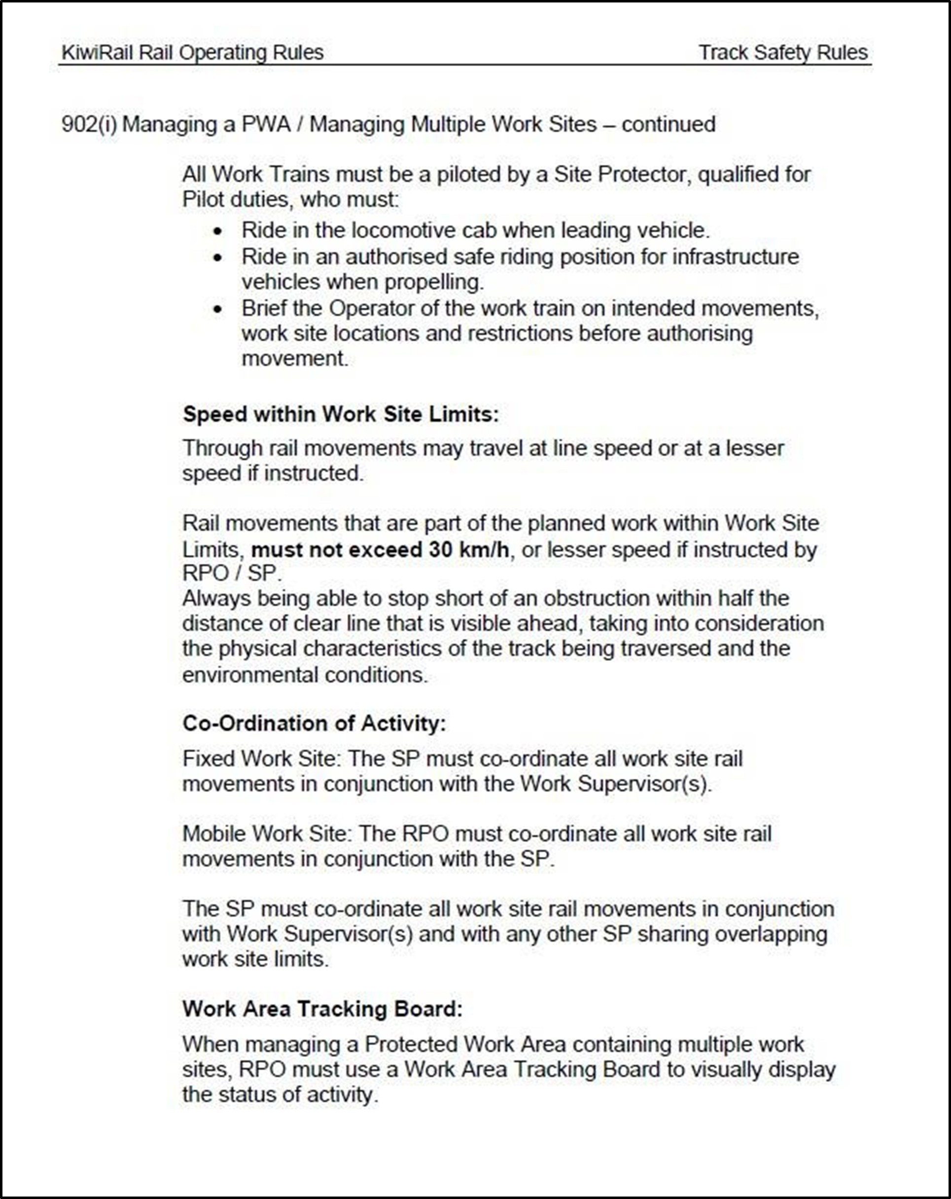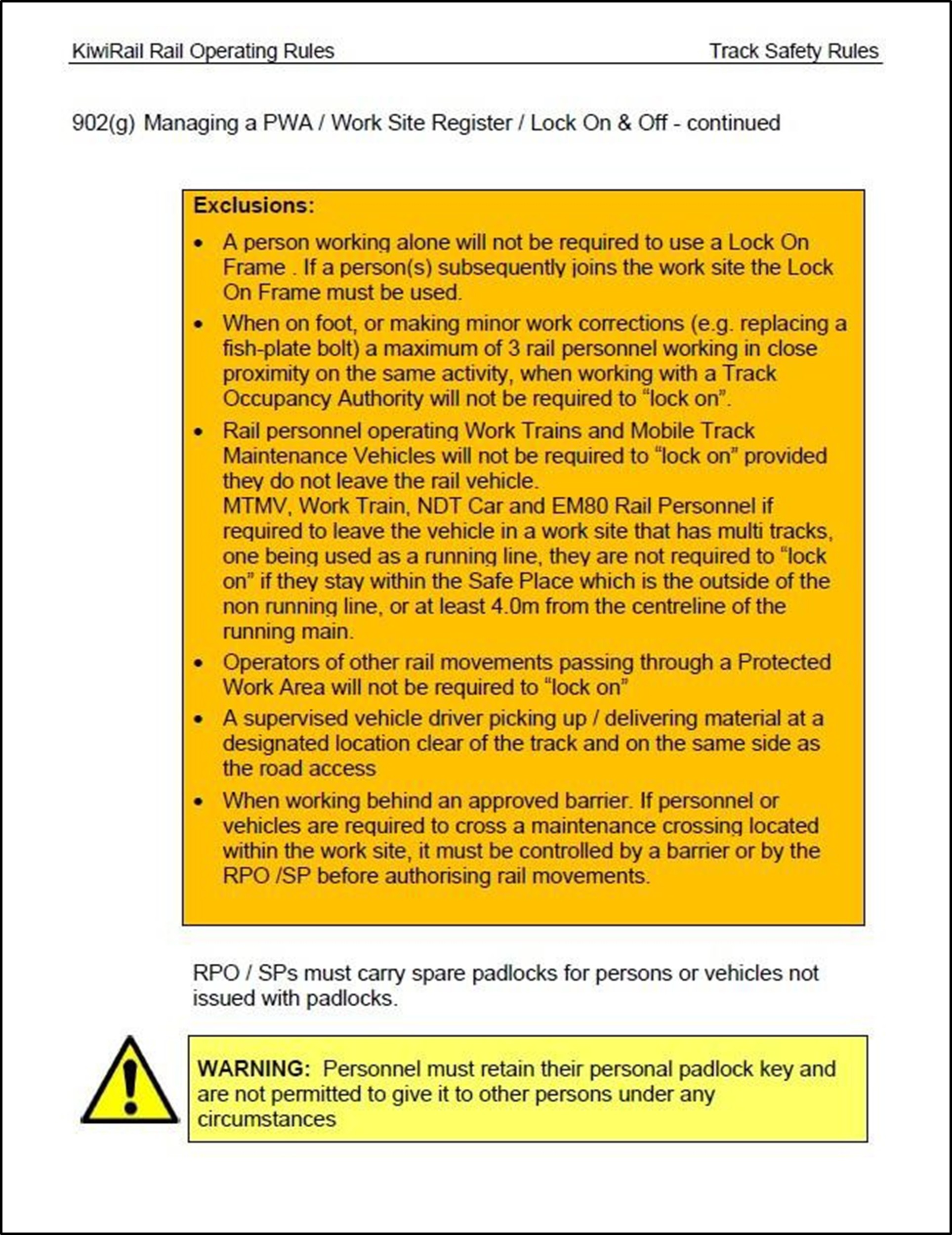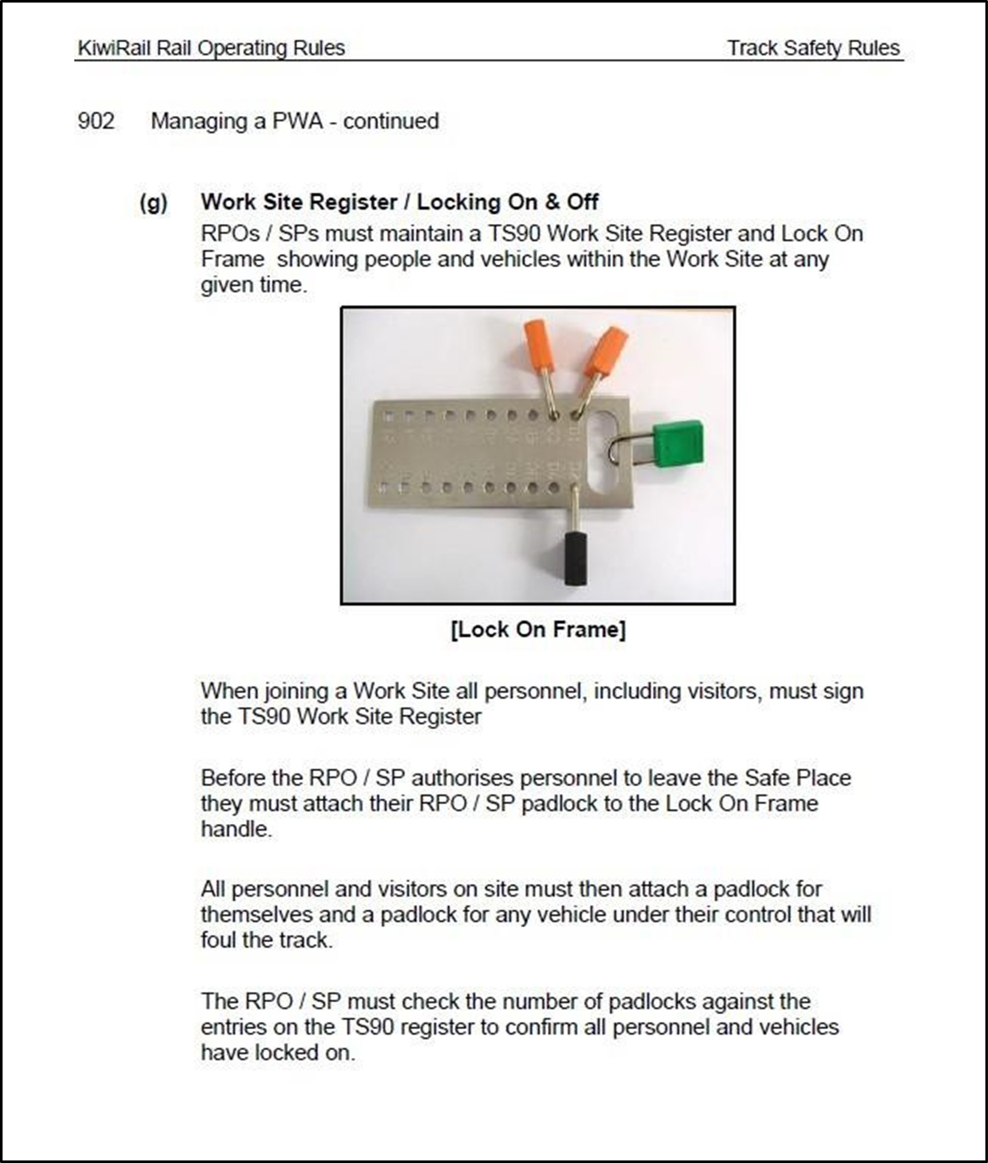 - Individual worksites within the Mis.60 area were required to operate under the guidelines of KiwiRail’s Rail Operations Rules and Procedures Rule 902 – Managing a Protected Work Area (PWA). Rule 902 protection included a requirement that each worker lock on to the worksite by using the frame and padlock system (see Figure 7 and Appendix 4).