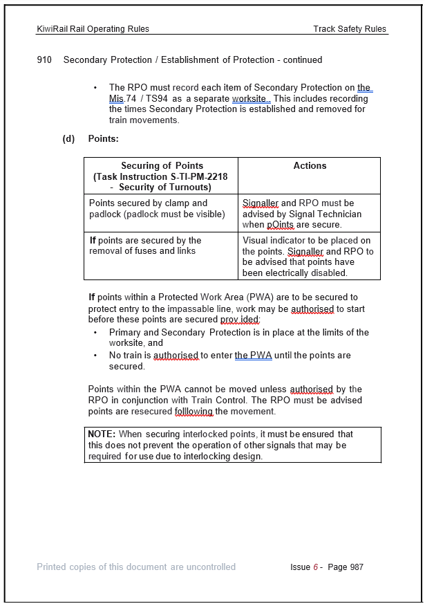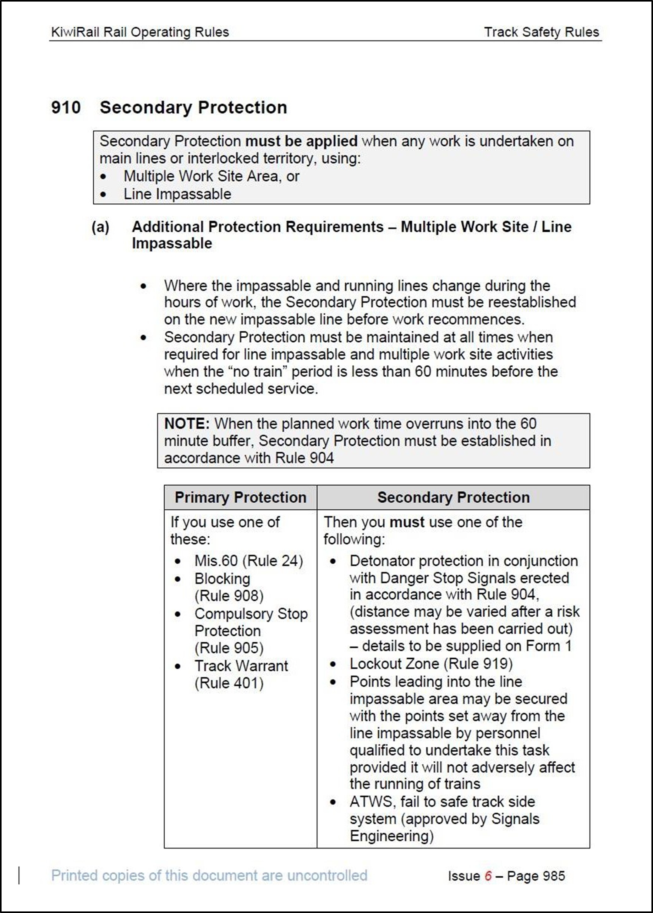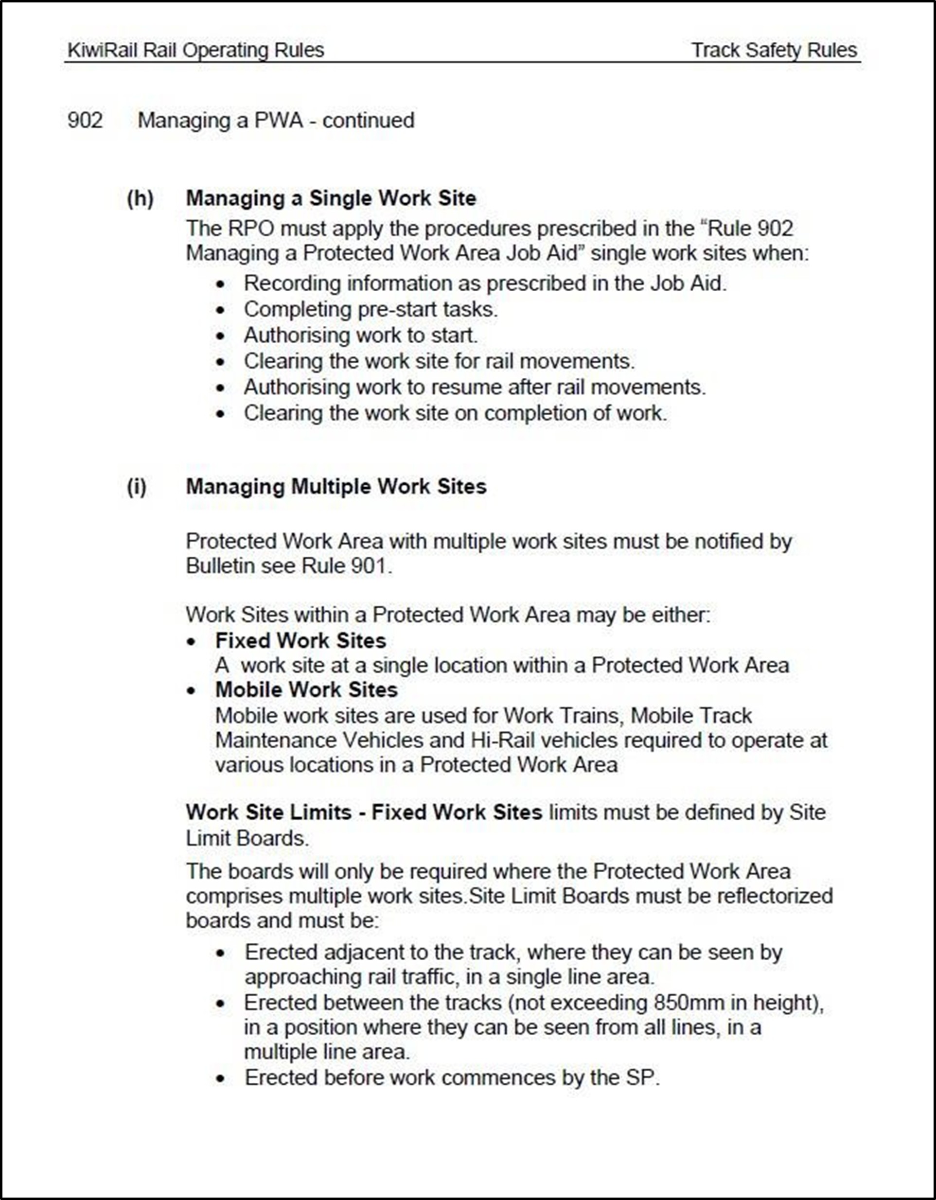 - Individual worksites within the Mis.60 area were required to operate under the guidelines of KiwiRail’s Rail Operations Rules and Procedures Rule 902 – Managing a Protected Work Area (PWA). Rule 902 protection included a requirement that each worker lock on to the worksite by using the frame and padlock system (see Figure 7 and Appendix 4).