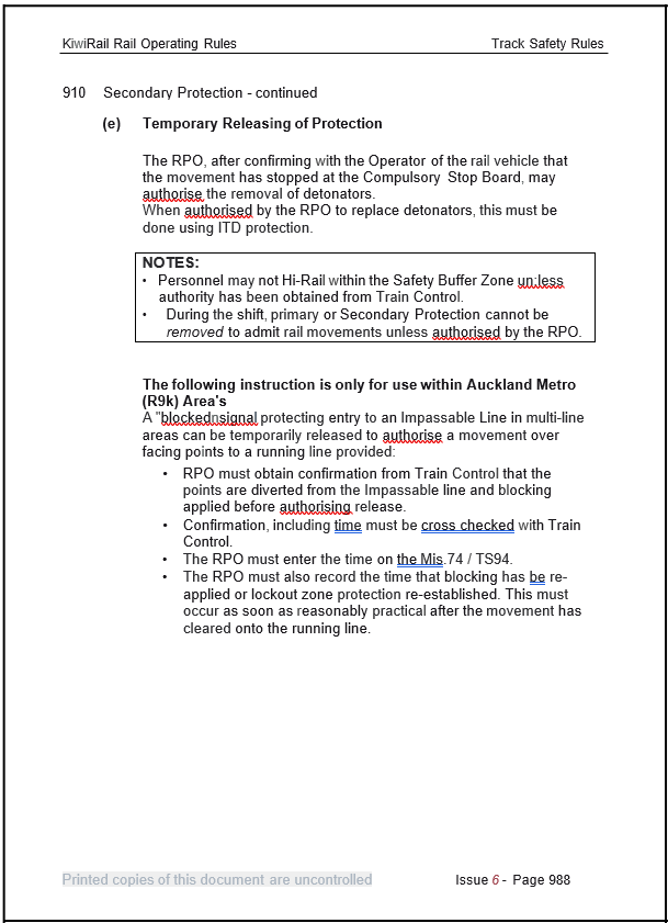 - The Commission acknowledges KiwiRail’s response. However, the routine removal of track was a major component of this project and the reliance on rules intended to authorise rail traffic past signals in a routine daily operational setting was not adequate for a major block of line operating for an extended period of time.