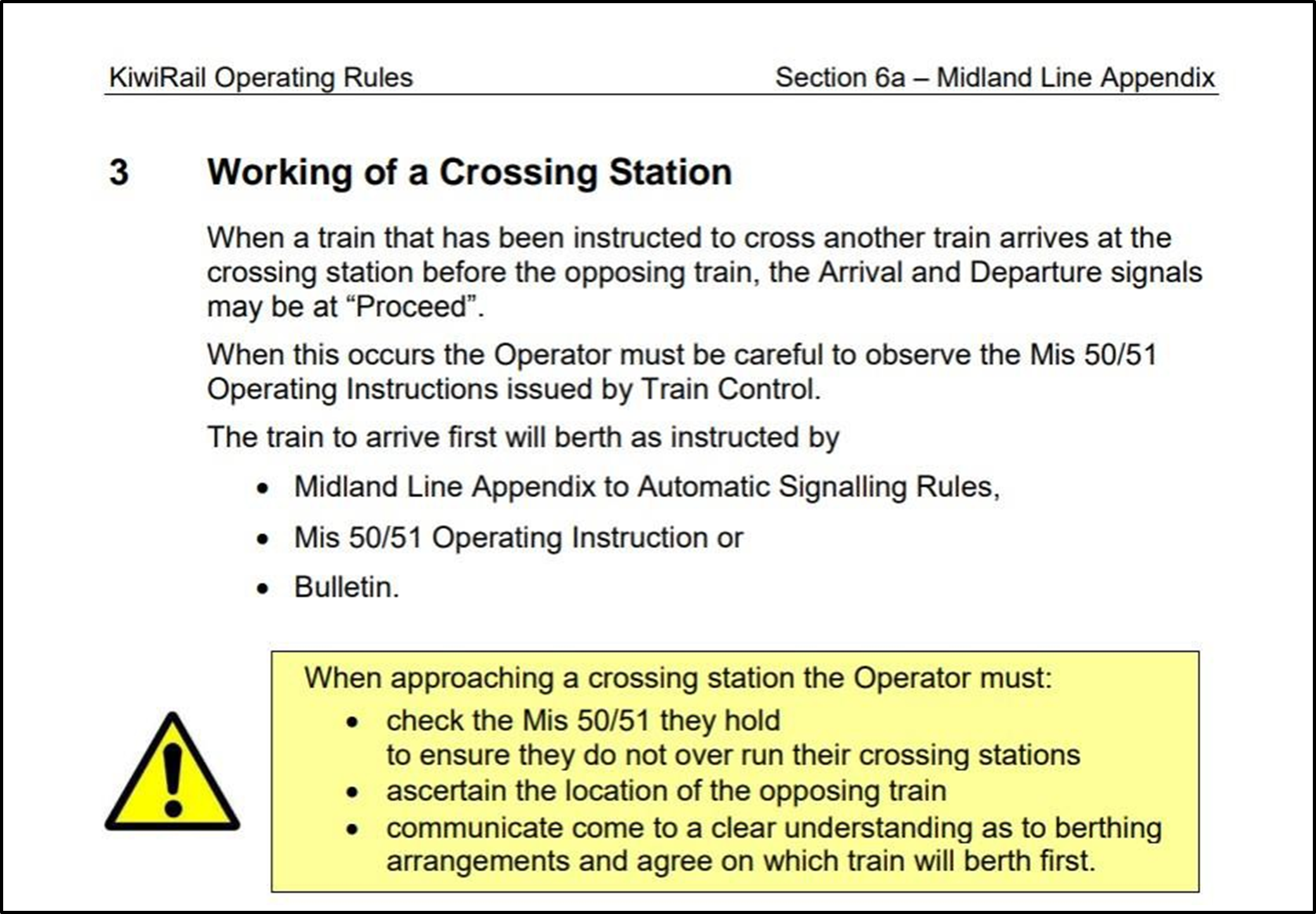 - KiwiRail requires LEs to be proficient in their knowledge of RORP Section 6a before they are certified to drive on the Midland line. The LE of Train 850 was considered by KiwiRail to be very experienced and was involved with the training and mentoring of trainee and newly qualified LEs on the Midland line.