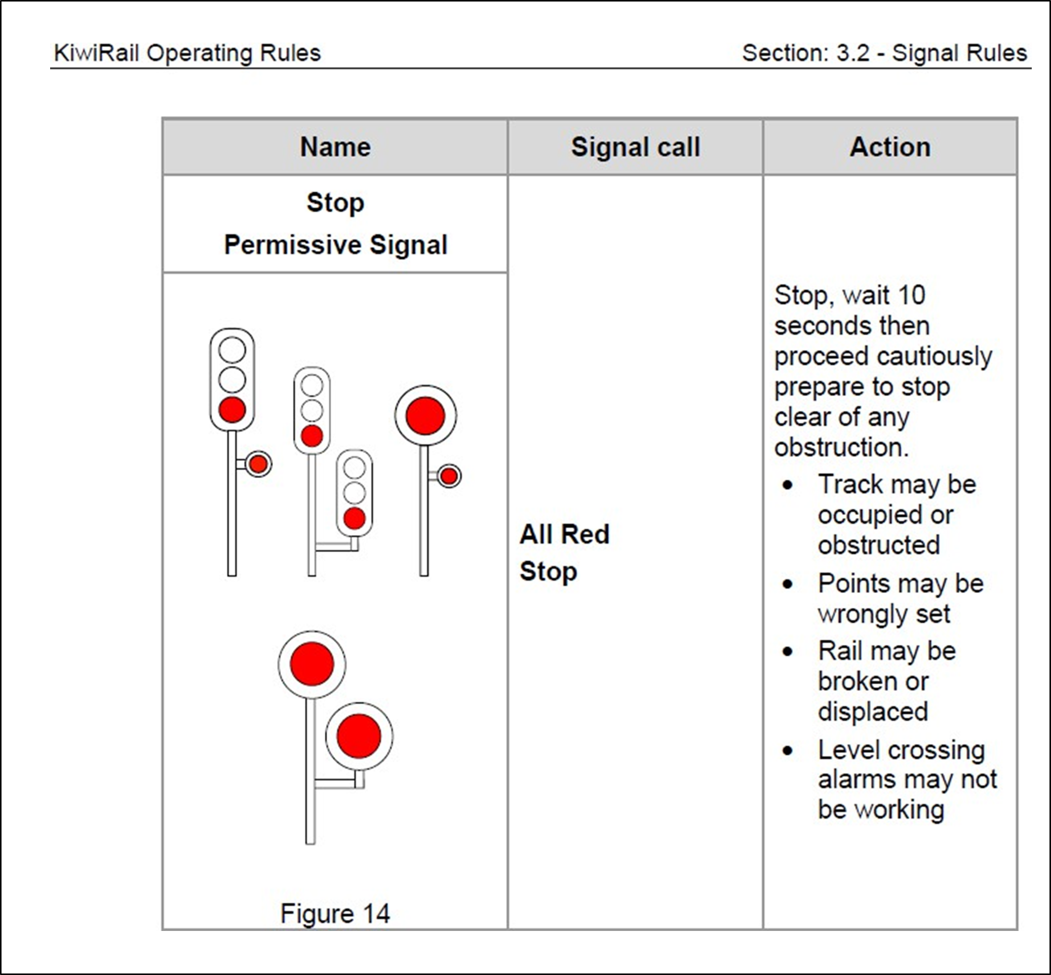 - When facing a red signal, KiwiRail’s Rail Operating Rules and Procedures prescribe what action LEs should take dependent on whether they are crossing another train and whether they are taking their own train into the loop or the main line (see appendices 1 and 2).
