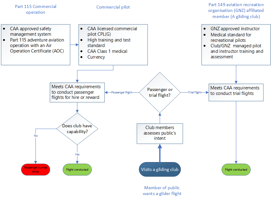 - Commercial glider operations are only permitted to take passenger flights under CAR Part 115. Under this rule part, a certificated operator must use glider pilots who hold commercial glider pilot licences (CPL(G)s) to take commercial glider flights. At the time of the accident there were no commercial glider operations active in New Zealand.